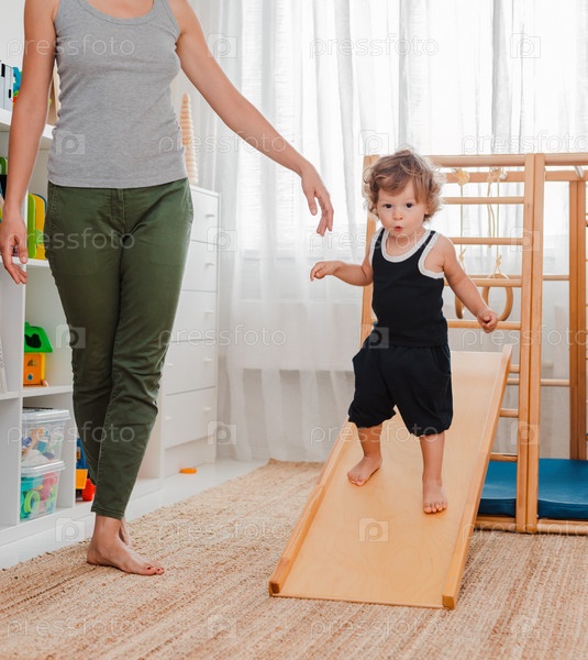 Ребенок в раннем возрасте 1,5 лет занимается в домашнем детском деревянном спортивном комплексе