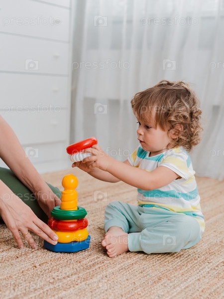 Мать и ребенок играют на полу в детской. Мама и маленький мальчик делают с пластиковыми разноцветными игрушками