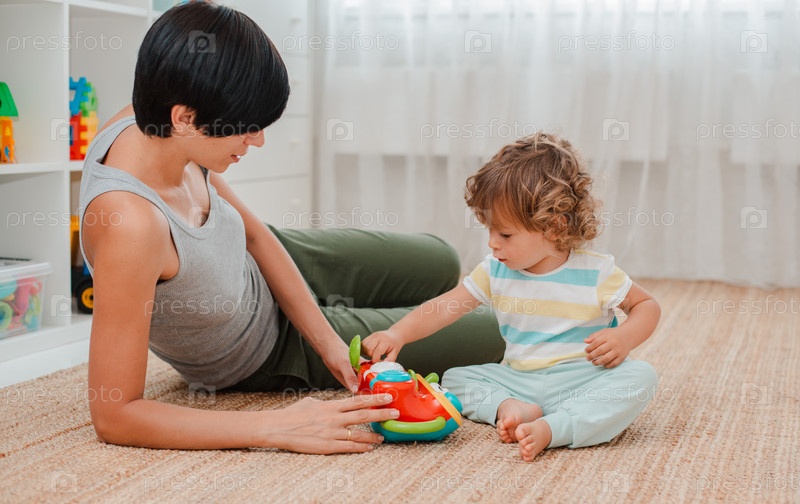 Мать и ребенок играют на полу в детской. Мама и маленький мальчик делают с пластиковыми разноцветными игрушками