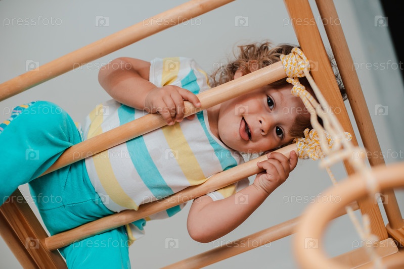 Ребенок в раннем возрасте 1,5 лет занимается в домашнем детском деревянном спортивном комплексе