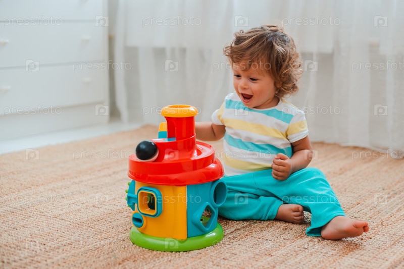 Ребенок играет на полу в комнате в развивающие пластиковые игрушки