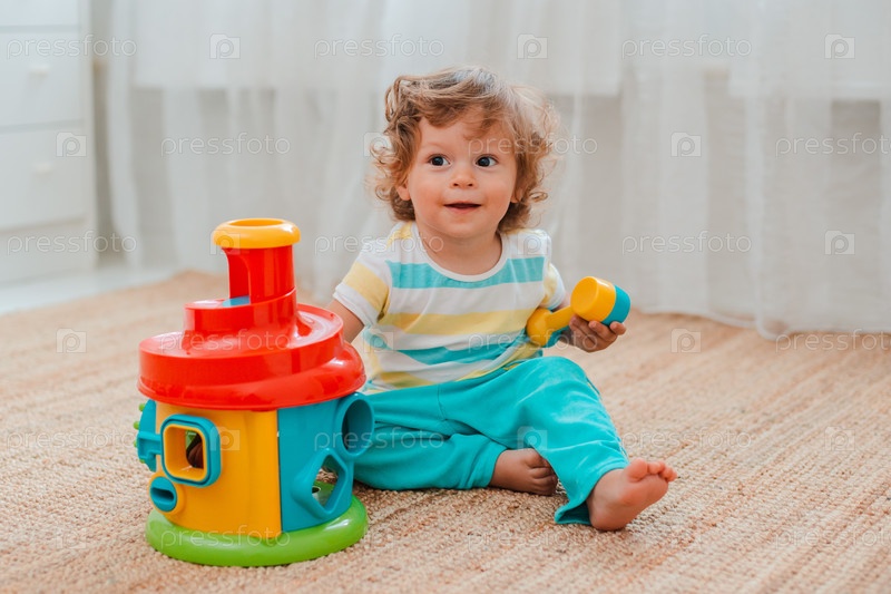 Ребенок играет на полу в комнате в развивающие пластиковые игрушки