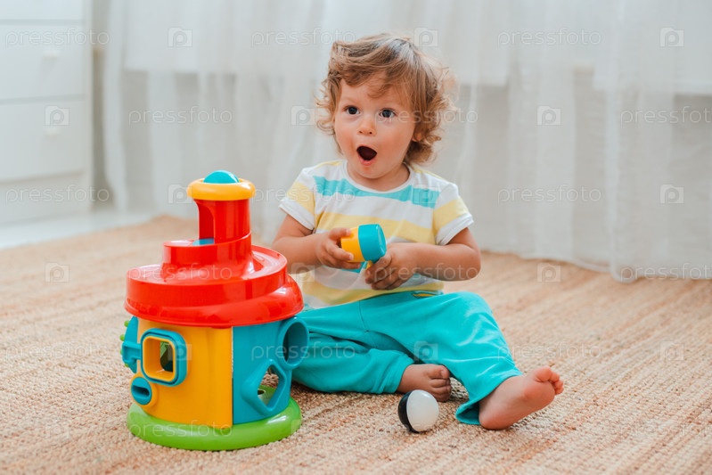 Ребенок играет на полу в комнате в развивающие пластиковые игрушки