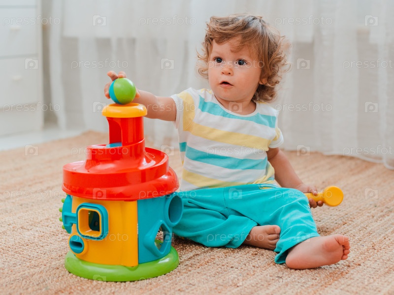 Ребенок играет на полу в комнате в развивающие пластиковые игрушки