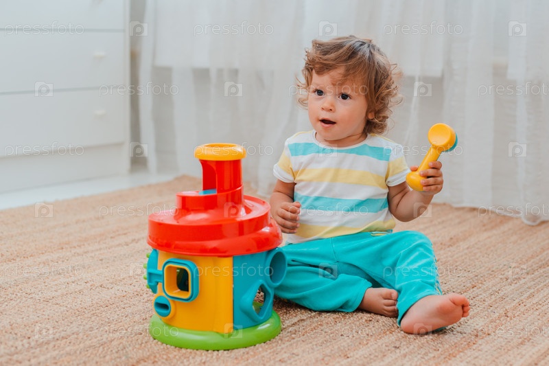 Ребенок играет на полу в комнате в развивающие пластиковые игрушки
