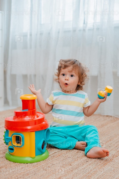 Ребенок играет на полу в комнате в развивающие пластиковые игрушки