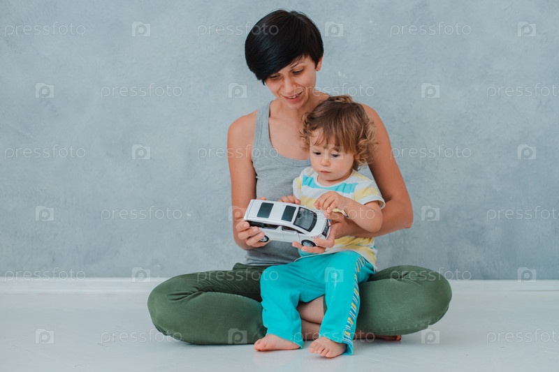 Мать и ребенок играют на полу в детской. Мама и маленький мальчик делают с пластиковыми разноцветными игрушками