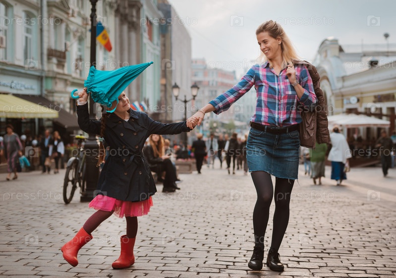 Маленькая девочка 6 лет с зонтиком в резиновых сапогах развлекается с мамой на скамейке в центре Москвы осенью или весной