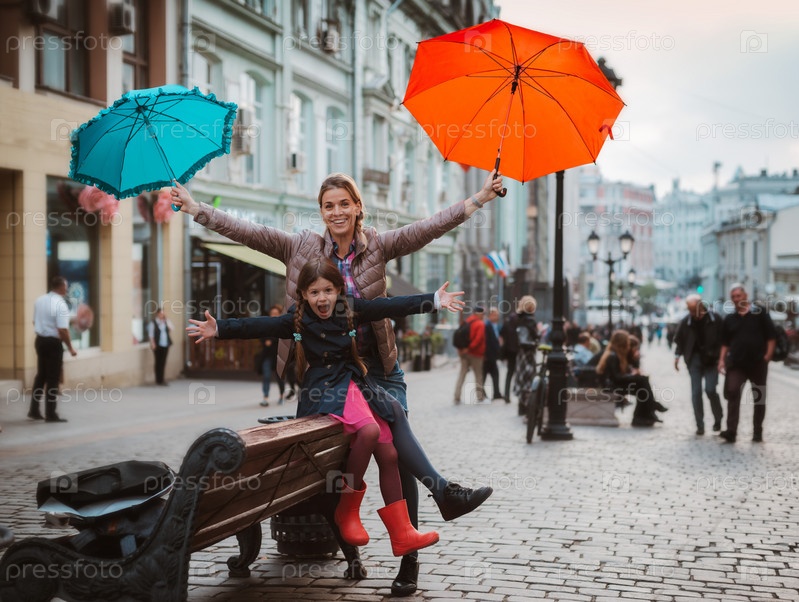 Маленькая девочка 6 лет с зонтиком в резиновых сапогах развлекается с мамой на скамейке в центре Москвы осенью или весной