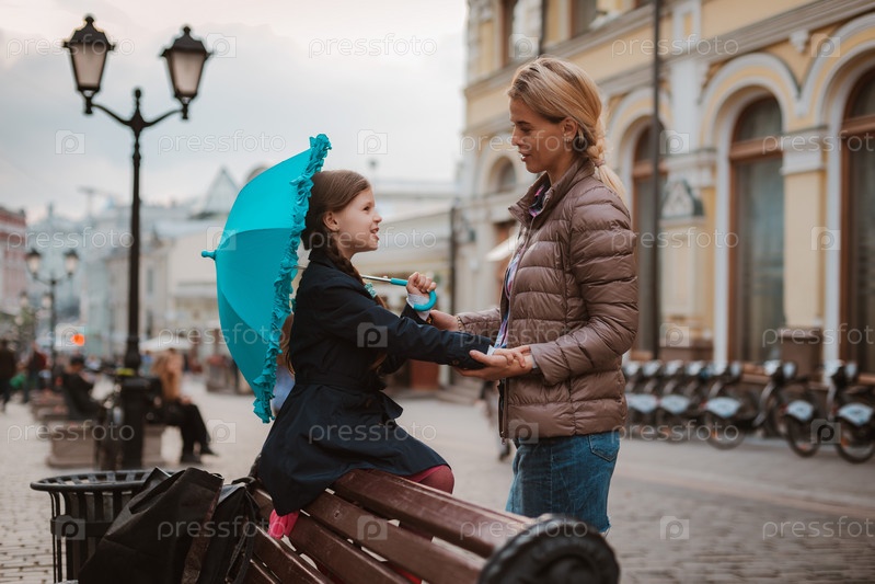Маленькая девочка 6 лет с зонтиком в резиновых сапогах развлекается с мамой на скамейке в центре Москвы осенью или весной