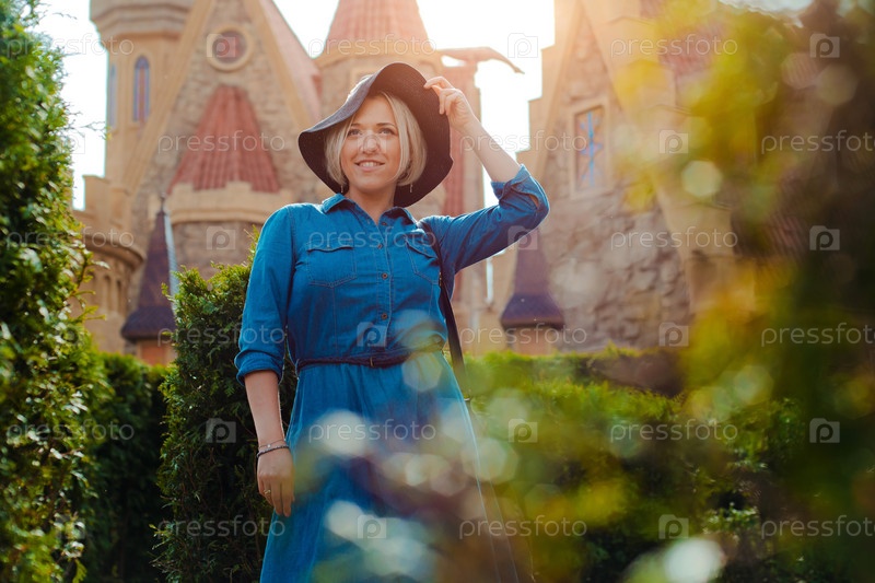 Портрет молодой красивой модной счастливой женщины, позирующей на улице на фоне средневекового Старого города