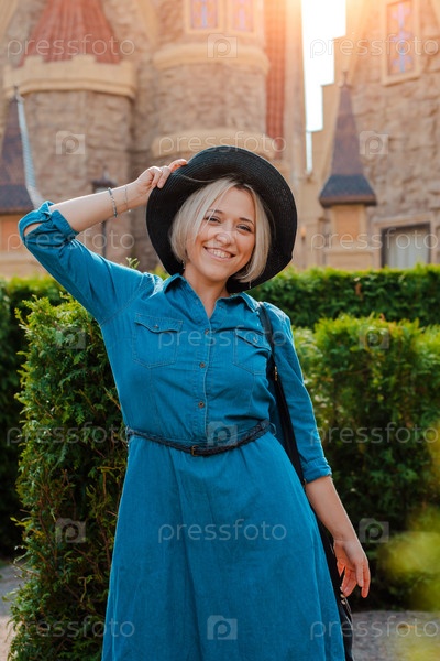 Портрет молодой красивой модной счастливой женщины, позирующей на улице на фоне средневекового Старого города