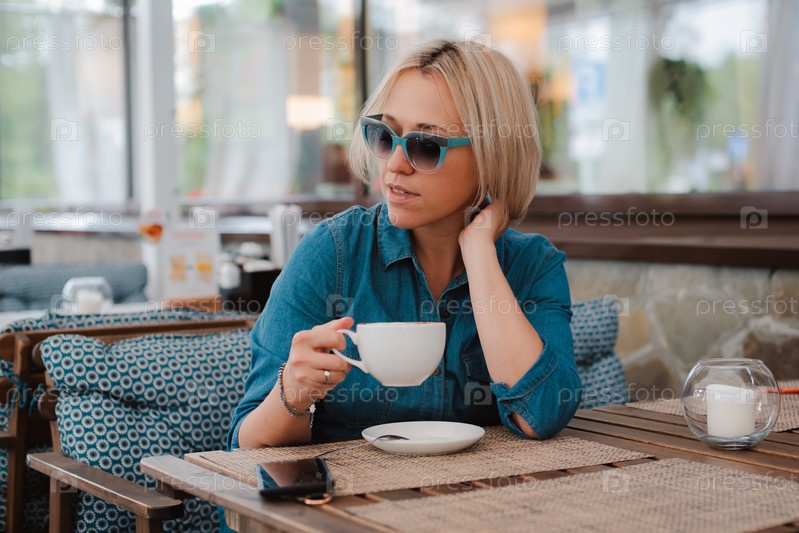 Крупным планом - летний портрет девушки в модных солнечных очках с утренней чашкой кофе, ярко-синего стильного платья