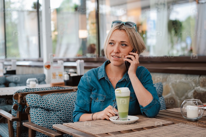 Молодая женщина пьет, наслаждаясь латте с зеленым чаем маття летним утром в кафе