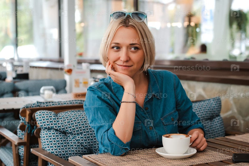Крупным планом - летний портрет девушки в модных солнечных очках с утренней чашкой кофе, ярко-синего стильного платья