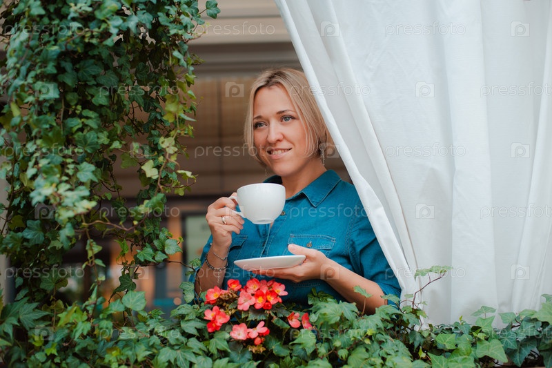 Красивая молодая женщина на балконе с цветами и белой занавеской, наслаждаясь утренней чашкой кофе