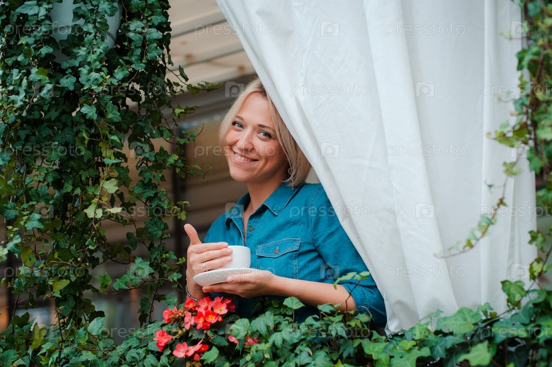 Красивая молодая женщина на балконе с цветами и белой занавеской, наслаждаясь утренней чашкой кофе