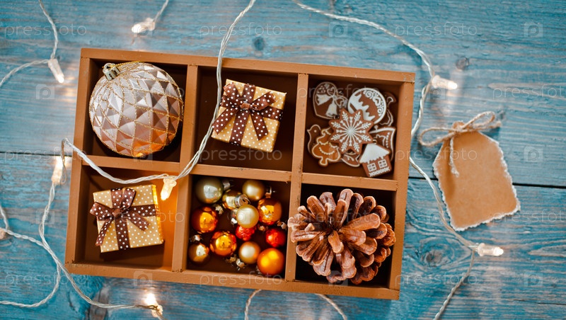 Рождественские украшения находятся в коробке на синем деревянном фоне