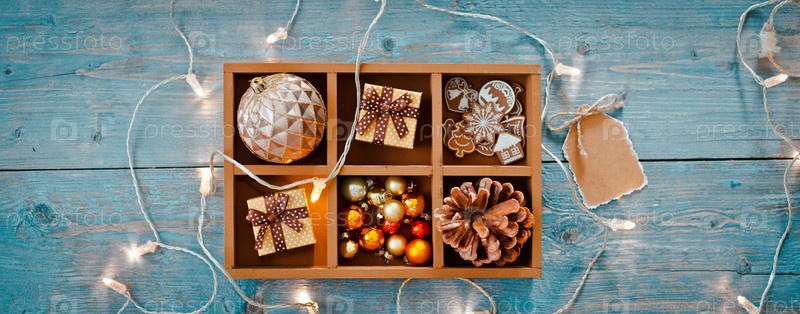 Рождественские украшения находятся в коробке на синем деревянном фоне