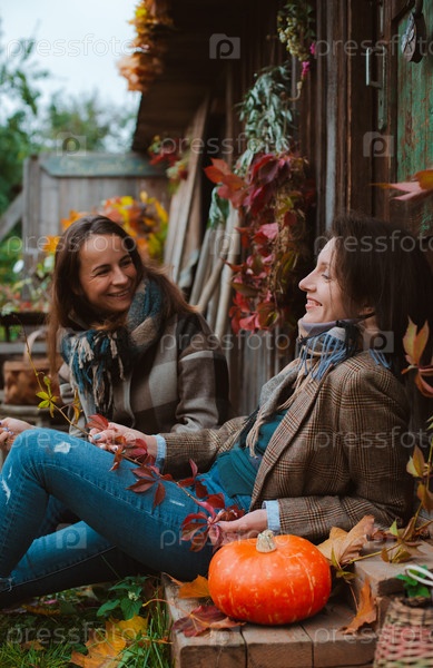 Две красивые молодые женщины, закрывающие лица желтым осенним листом, улыбаясь на старом деревянном фоне. Осенний модный сезон