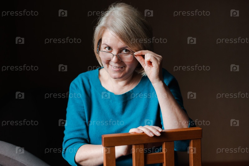 Портрет пожилой красивой женщины на пенсии в очках на фоне дома