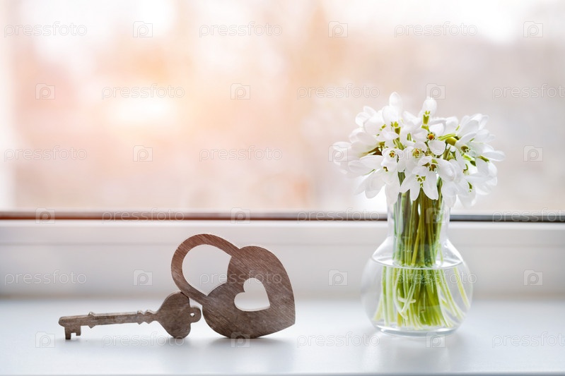 Подснежники в вазе у окна с декоративным замком в виде сердца. Атмосферный и романтичный фон для поздравления с Днем святого Валентина