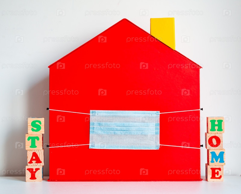 Красный дом с посланием и медицинской маской. Концепция социальной дистанции, дистанционного обучения, домашнего образования, коронавируса, карантина. Оставайтесь дома, оставайтесь в безопасности
