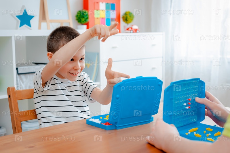 Мальчик с папой, играющим в военные корабли и подводные лодки, размещаются на игровом поле в игре «Морской бой». развлечение