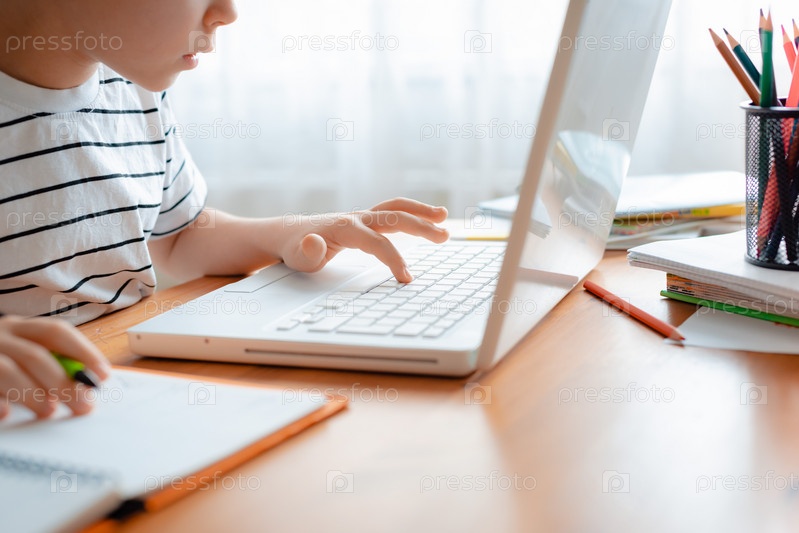 Дистанционное обучение онлайн образование. Школьник учится дома и делает домашнее задание. Домашнее дистанционное обучение