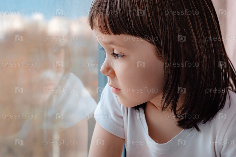 Маленькая девочка дома во время карантина с надеждой смотрит в оконное стекло