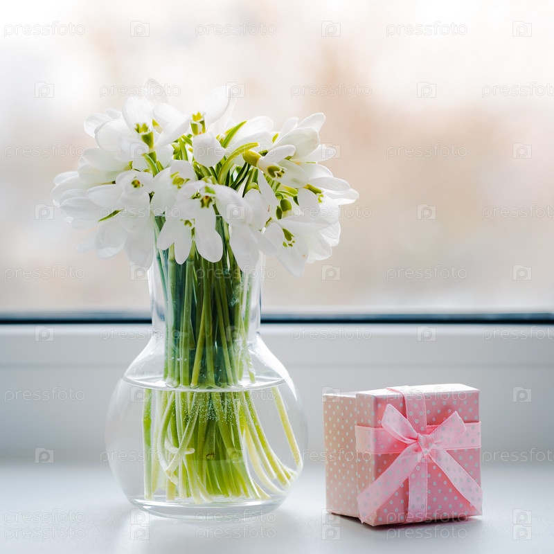 Красивые букеты подснежников в стекле в лучах весеннего солнца на подоконнике с розовой подарочной коробкой
