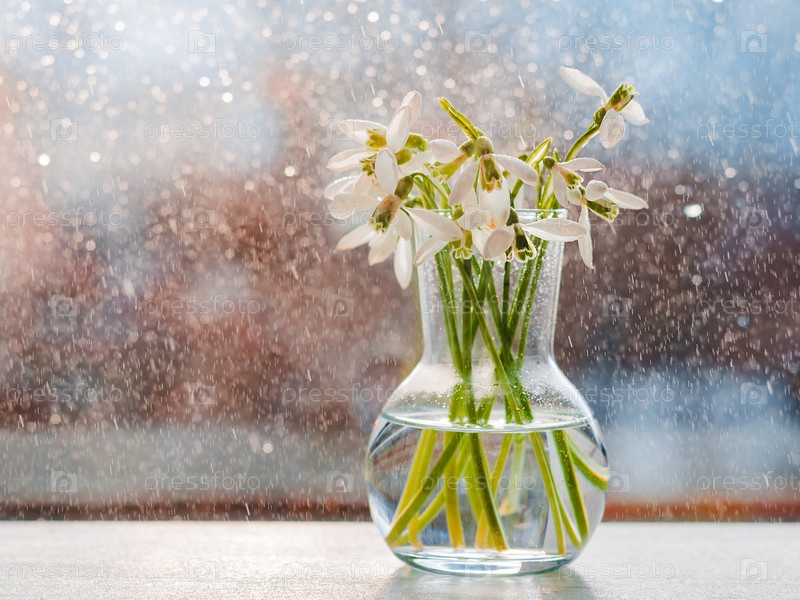 Красивые букеты подснежников в стекле в лучах весеннего солнца на подоконнике с летящими каплями воды. свободное пространство, фон с красивыми боке каплями
