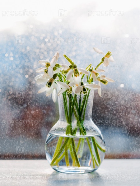 Красивые букеты подснежников в стекле в лучах весеннего солнца на подоконнике с летящими каплями воды