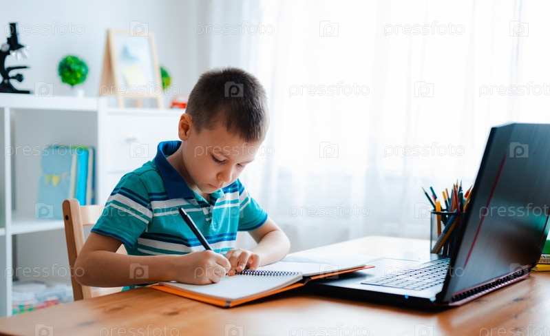 Дистанционное обучение онлайн образование. Школьник учится дома и делает домашнее задание. Домашнее дистанционное обучение
