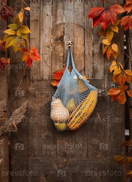 Здравствуй, осень. Серая хозяйственная сумка с осенним урожаем, висящая на старой деревенской деревянной двери загородного дома, экосумка с разнообразными сезонными овощами, желтая тыква, кабачки и груши