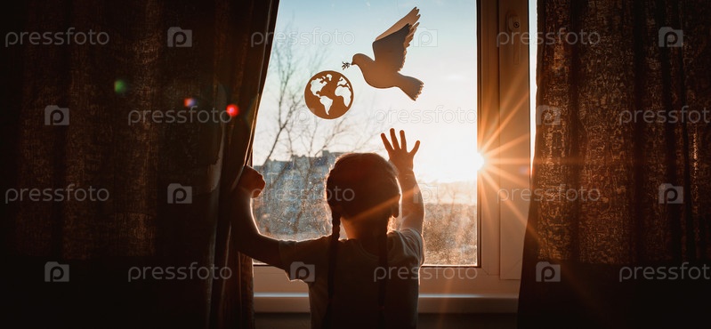 Ребенок протягивает руки солнечному свету, за окном летит голубь мира с веткой силы земного шара. концепция мира во всем мире, без войны, экология