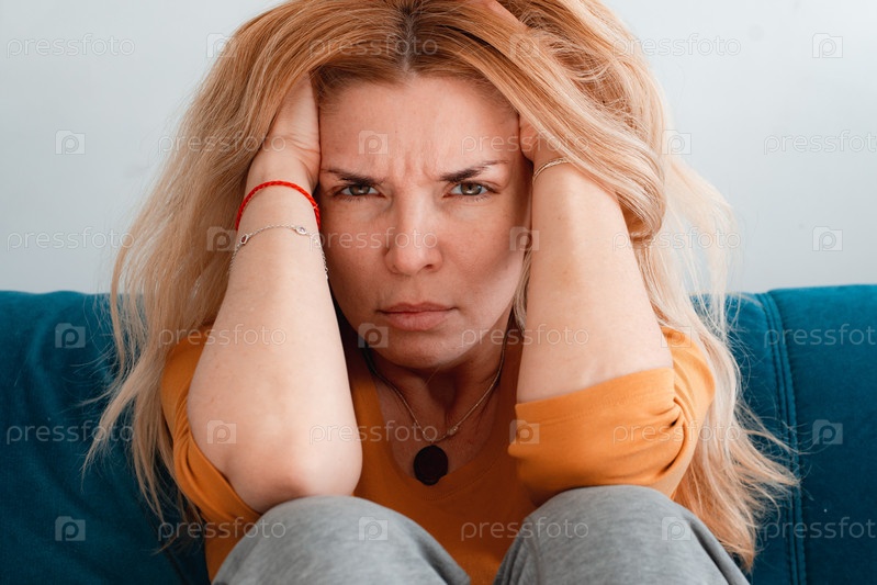 Расстроенная злая блондинка держит руки в волосах в желтой блузке крупным планом