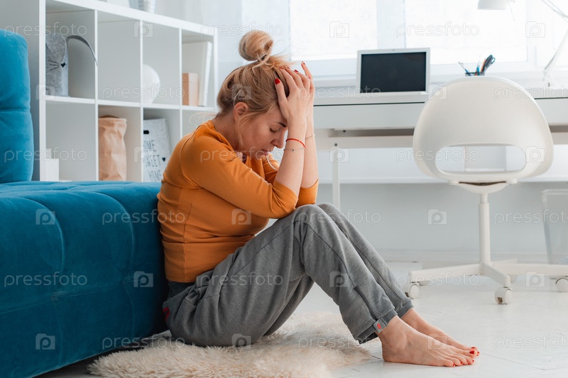 Несчастная женщина в депрессии, трогает волосы, сидит дома на полу, думает о проблемах, расстроенная девушка чувствует себя одинокой и грустной, психологическими и психическими проблемами, страданиями