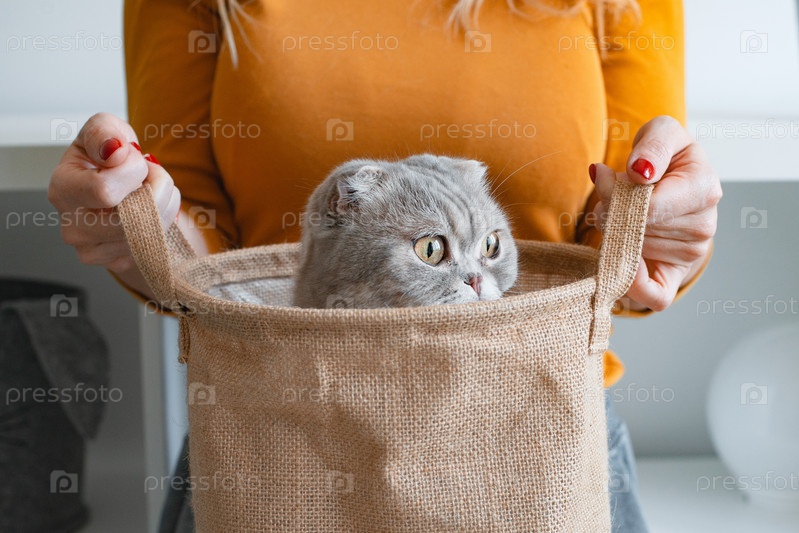 Смешной серый кот сидит в корзине из мешковины, которую держит женщина в желтой куртке. Концепция кота в мешке, неизвестность, сюрприз, подделка, домашнее животное, уход, приют для животных