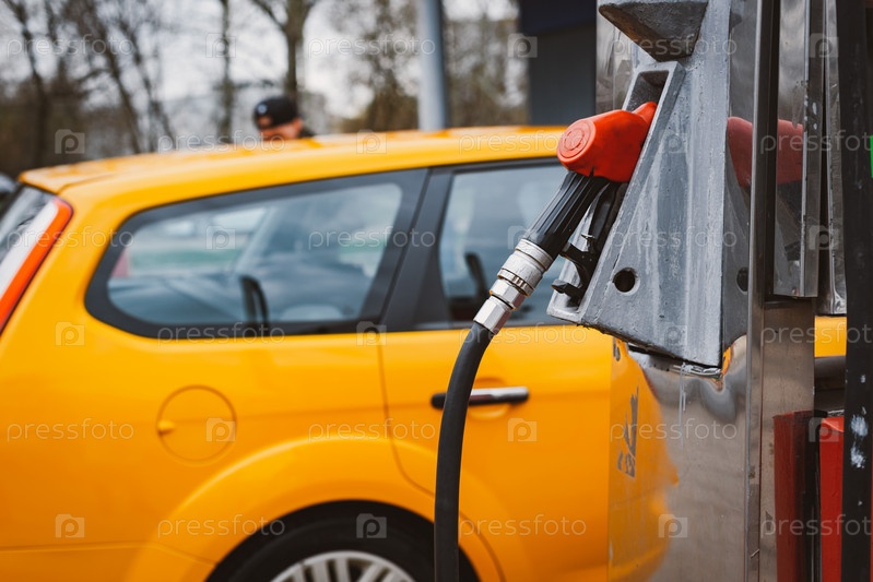 Неузнаваемый мужчина заправляет машину бензином на заправке. Концепция высоких цен на бензин, санкции, Россия