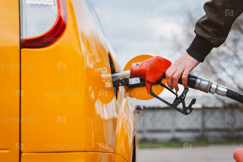 Неузнаваемый мужчина заправляет машину бензином на заправке. Концепция высоких цен на бензин, санкции, Россия