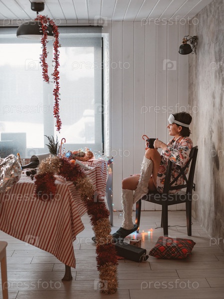 Молодая уставшая женщина сидит на стуле в пижаме и маске для сна в грязной комнате после новогодней вечеринки