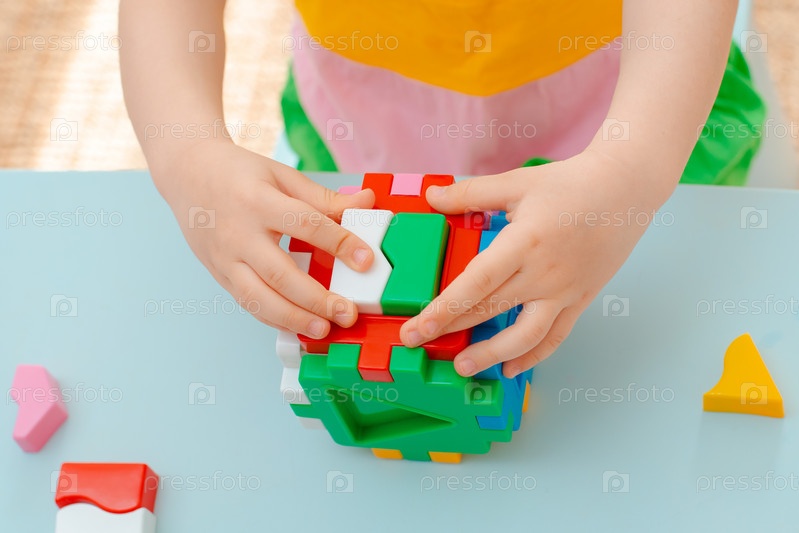 Крупным планом руки ребенка собирают сортировщик головоломок. Куб со вставленными геометрическими фигурами и цветными пластиковыми блоками