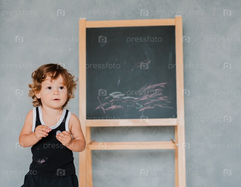 Маленький ребенок рисует мелом на черной меловой доске дома в детской на фоне серой стены