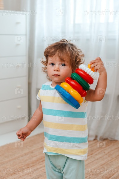 Ребенок играет на полу в комнате в развивающие пластиковые игрушки