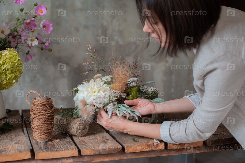 Женский профессиональный флорист готовит композицию из полевых цветов