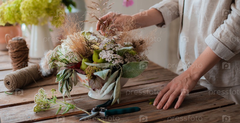 Женский профессиональный флорист готовит композицию из полевых цветов