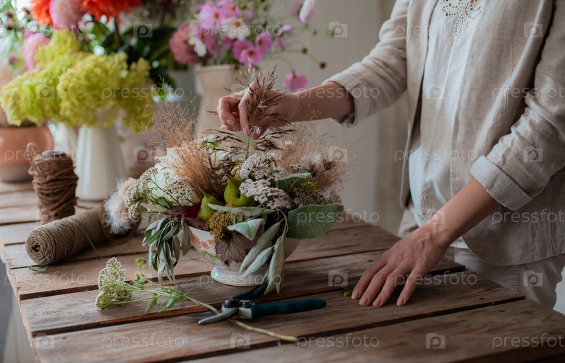 Женский профессиональный флорист готовит композицию из полевых цветов