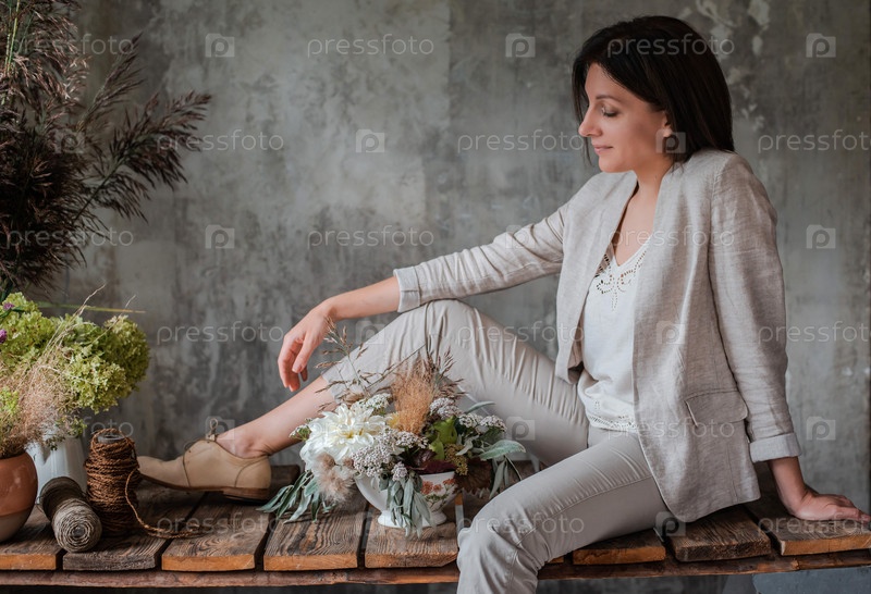 Женский профессиональный флорист готовит композицию из полевых цветов