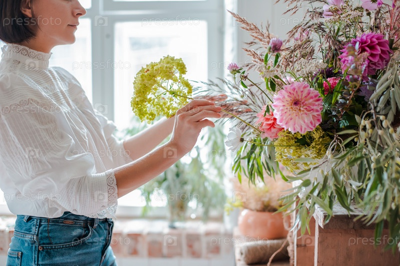 Женский профессиональный флорист готовит композицию из полевых цветов